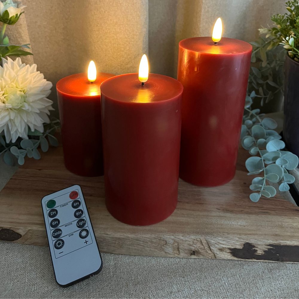LED-Blockkerzen, 3 Stück in Rot – mit 3D-Flamme und Fernbedienung